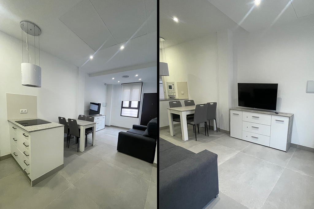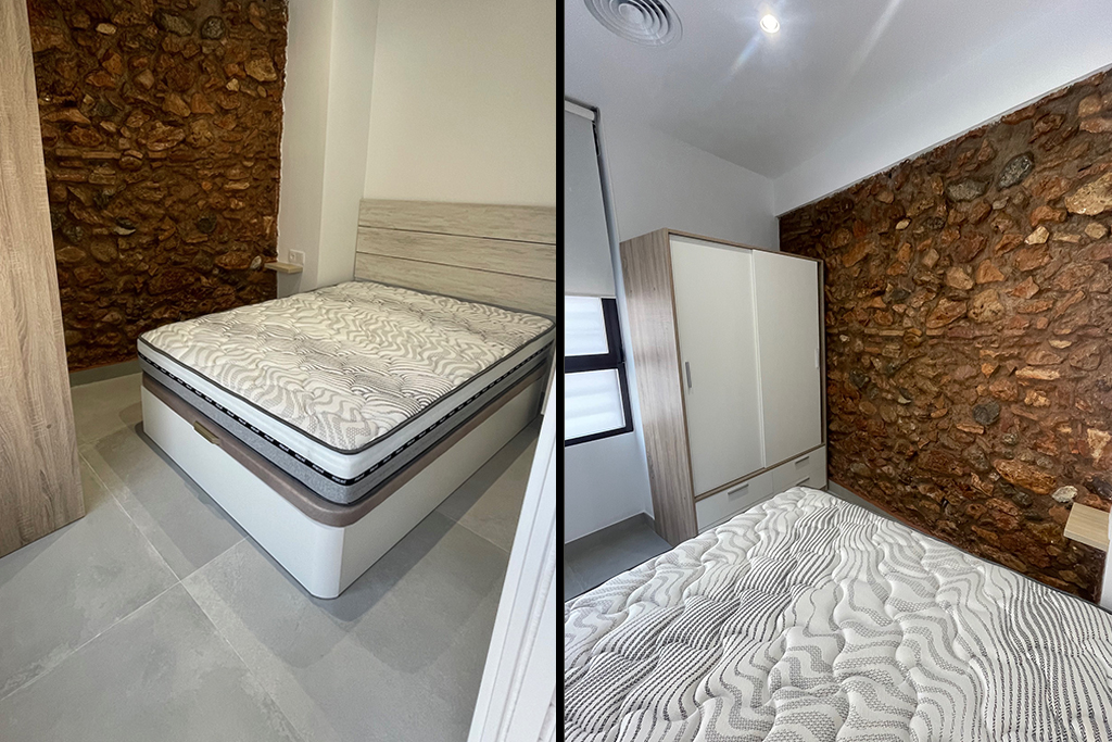 Aunque el edificio original responde a una construcción tradicional, la intervención introduce materiales actuales que aportan ligereza y durabilidad: muros de pladur, suelos porcelánicos, mobiliario de madera lacada y una encimera de piedra natural. El resultado es una vivienda compacta pero generosa, donde cada rincón está pensado para ser vivido