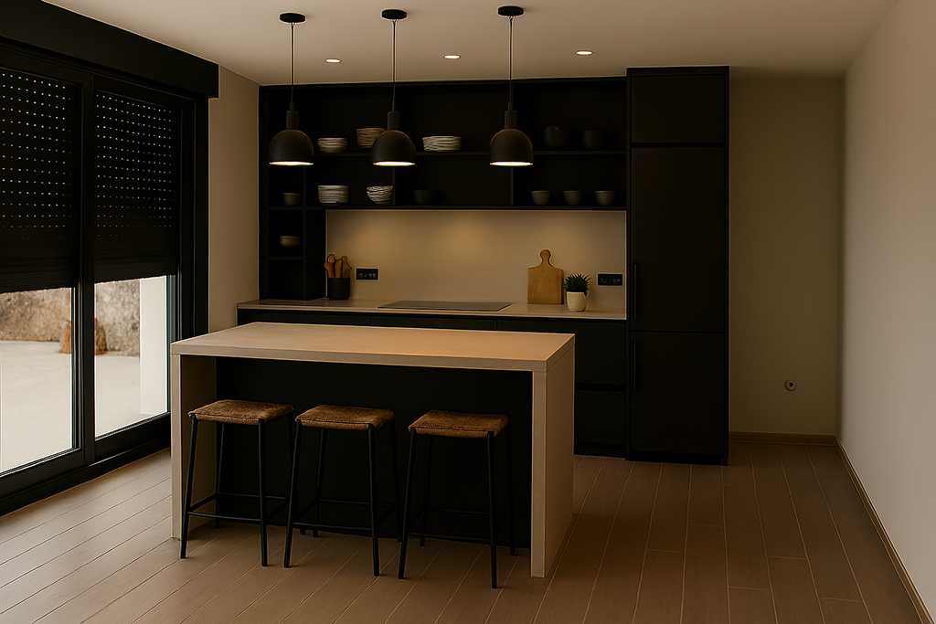 Junto al acceso dispone de una zona amplia para uso como garaje y al fondo el salón comedor con cocina integrada se abre al patio interno con grandes aberturas.